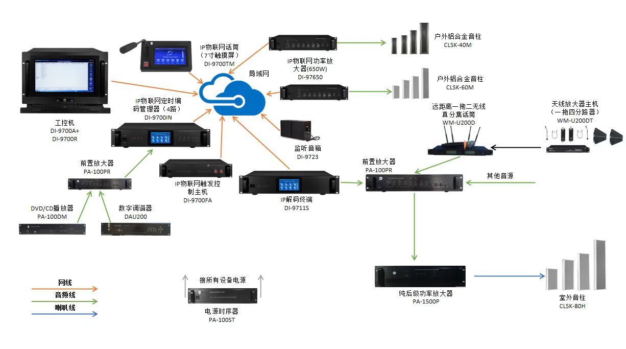 IP網(wǎng)絡(luò)系統(tǒng)配套有CD播放器、調(diào)諧器、音樂節(jié)目庫,滿足學(xué)校上課、下課、開展節(jié)目等音樂播放,并可實(shí)現(xiàn)在不同的區(qū)域同時(shí)播放不同的內(nèi)容;