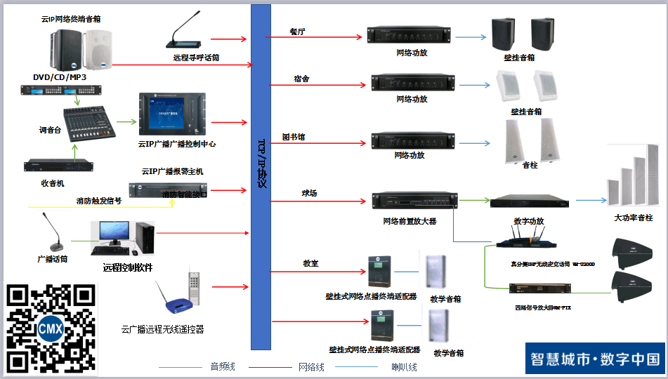 傳輸:網(wǎng)絡(luò)交換機(jī),通信光纖,光纖接口,廣播音箱線,室內(nèi)音箱,室外音柱。
