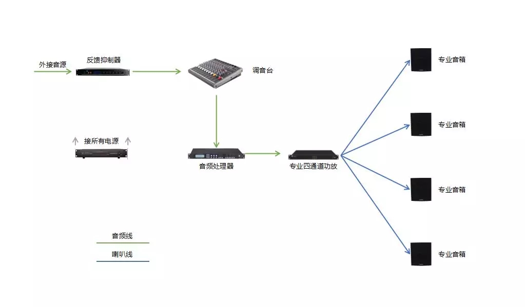 會(huì)議擴(kuò)聲系統(tǒng),根據(jù)會(huì)議室擴(kuò)聲特性一級(jí)指標(biāo)要求,設(shè)計(jì)出系統(tǒng)與現(xiàn)場(chǎng)的配置,以減小聲能的擴(kuò)散反射、聲干擾、聲聚焦等學(xué)現(xiàn)象對(duì)語言擴(kuò)聲清晰度造成的不良影響。整個(gè)擴(kuò)聲系統(tǒng)采用主音箱,輔助音箱到4個(gè)角落的音箱放置,每個(gè)區(qū)域都能提供優(yōu)質(zhì)的音響效果。