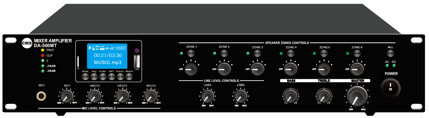 6分區(qū)揚聲器輸出帶獨立音量調(diào)節(jié)和獨立分區(qū)開關(guān);