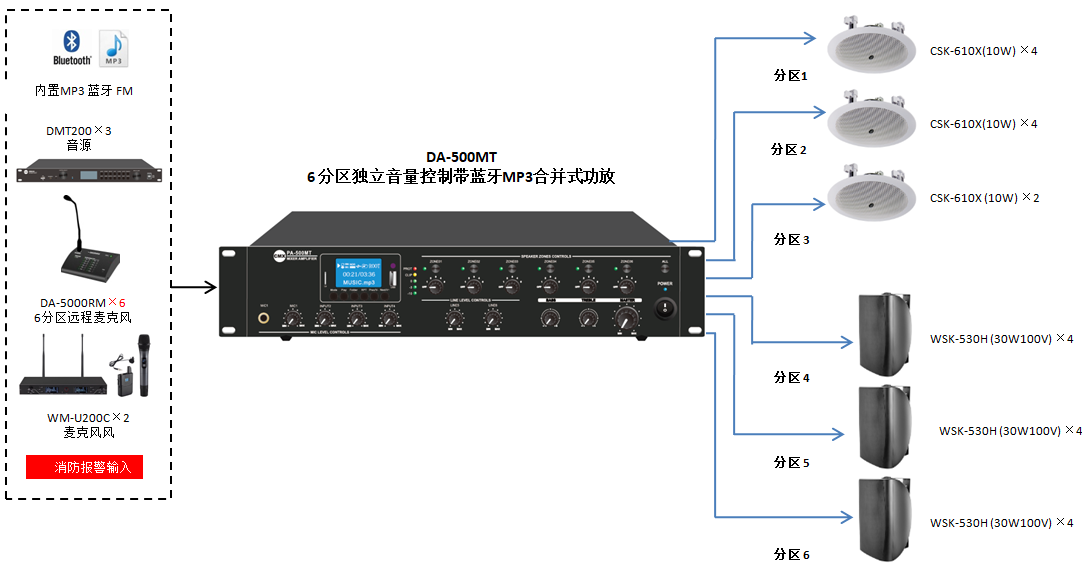 藍(lán)牙MP3多音源6分區(qū)音量獨立調(diào)節(jié)合并機(jī) |