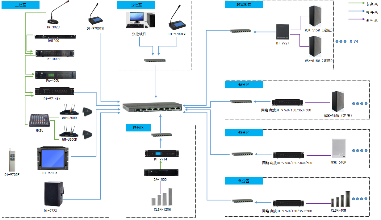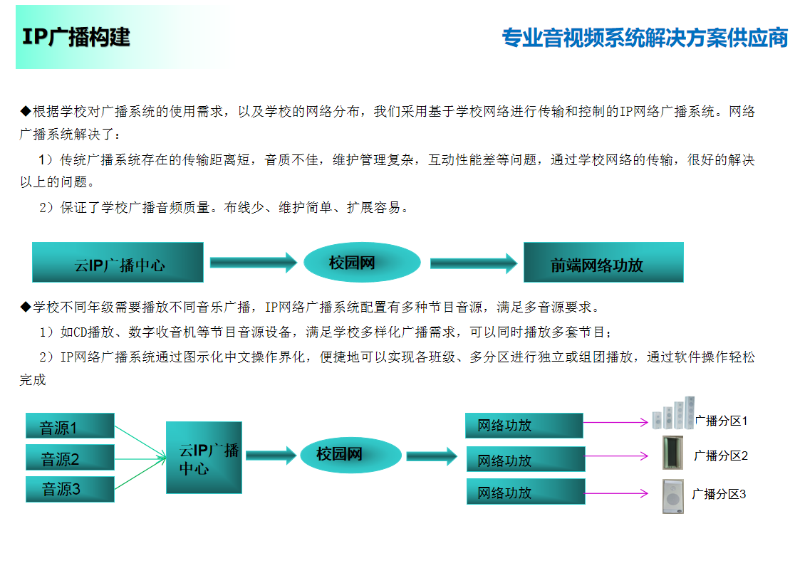 隨著國家對普教的重視,改進教學設施完備、教育特色鮮明、辦學質量一流的小學,逐步完善的現(xiàn)代信息化管理系統(tǒng),給新時代的教學管理注入了新的活力。小學數(shù)字信息化建設的不斷革新,小學的建設發(fā)展也受到國家和地方的日益重視,為完善現(xiàn)代化的教學管理, 營造更為舒適的小學生活環(huán)境,小學需要設計一套數(shù)字化的廣播系統(tǒng),要求廣播覆蓋每一個班級每個教學點及公共區(qū)同步,整個小學區(qū)的的各功能區(qū)室外環(huán)境,主要滿足日常背景音樂的需求,兼顧校園廣播通知、應急消防災難性廣播指揮等功能。