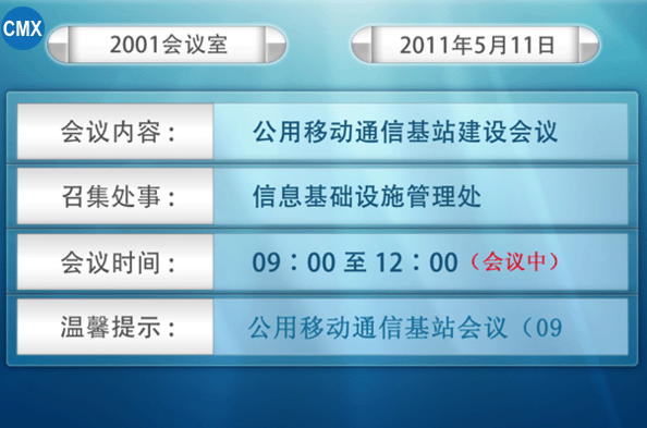 說(shuō)明:用于會(huì)議室門(mén)口的標(biāo)牌,顯示該會(huì)議室當(dāng)天的會(huì)議情況。