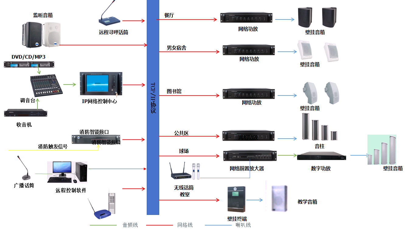 布線方式:機房至每層用校園IP網(wǎng)絡(luò),每個區(qū)至前端喇叭使用音頻線。