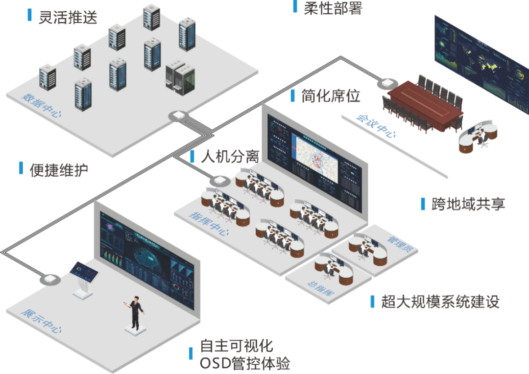 如需控制端統(tǒng)一操控不同區(qū)域的本地系統(tǒng),僅需將各區(qū)域的以太網(wǎng)交換機(jī)進(jìn)行堆疊(級聯(lián)或跨網(wǎng))并進(jìn)行必要網(wǎng)絡(luò)配置即可輕松實現(xiàn)。連接配置完成后,即可視為統(tǒng)一的整體??深A(yù)覽其他區(qū)域視頻信號、音頻信號、串口信號進(jìn)行控制、感知狀態(tài)等,從而實現(xiàn)多區(qū)域信號和控制互聯(lián)互通,資源整合利用。是構(gòu)建大型應(yīng)急中心、指揮中心、控制室、信息中心、調(diào)度中心、決策室、監(jiān)控中心、會商討論、業(yè)務(wù)聯(lián)動、大數(shù)據(jù)可視化、成果展示等多位一體化的行業(yè)數(shù)據(jù)、信息可視化、交互式溝通應(yīng)用平臺,甚至是實現(xiàn)廣域?qū)>W(wǎng)互聯(lián)互通的應(yīng)用。