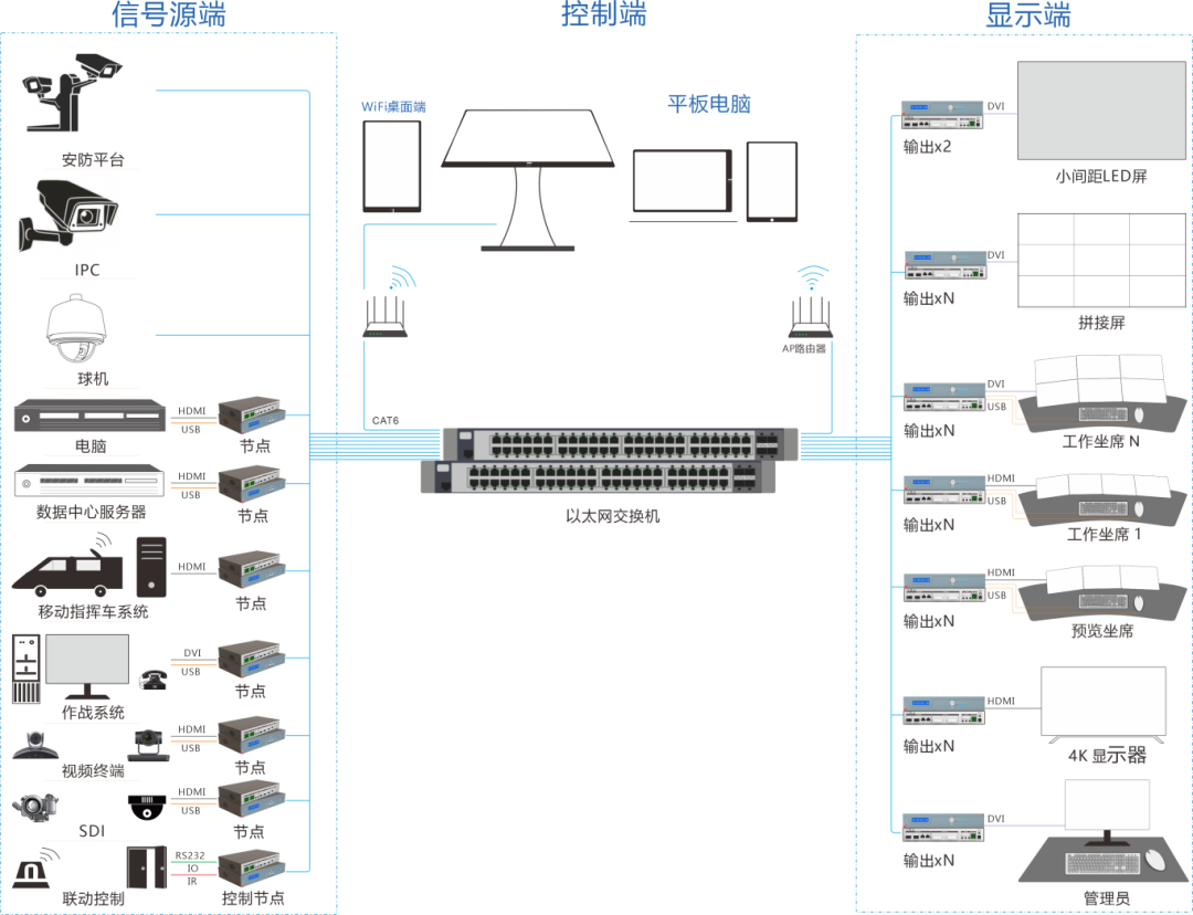 系統(tǒng)輸入/輸出節(jié)點僅通過網(wǎng)線或光纖互聯(lián)互通組成分布綜合系統(tǒng),布線簡單且為您節(jié)省成本;全網(wǎng)絡(luò)化的智能管理,不再受限于空間與地域,形成各區(qū)域互通互聯(lián),打造視頻、音頻、語音對講、串口及其它等等資源融合,構(gòu)建更適應(yīng)指揮中心、調(diào)度中心、大型盛會、多異地會議等管理,網(wǎng)絡(luò)互通級聯(lián)實現(xiàn)無限拓展;在系統(tǒng)中,每個輸入/輸出節(jié)點均獨立工作,也可以協(xié)同工作,任意節(jié)點故障不影響整個系統(tǒng)的運(yùn)行;增加或減少節(jié)點不會影響其他節(jié)點工作,節(jié)點體積小且?guī)в羞h(yuǎn)程KVM坐席鍵盤鼠標(biāo)、USB接口、RS232控制串口等功能,易于安裝維護(hù)。