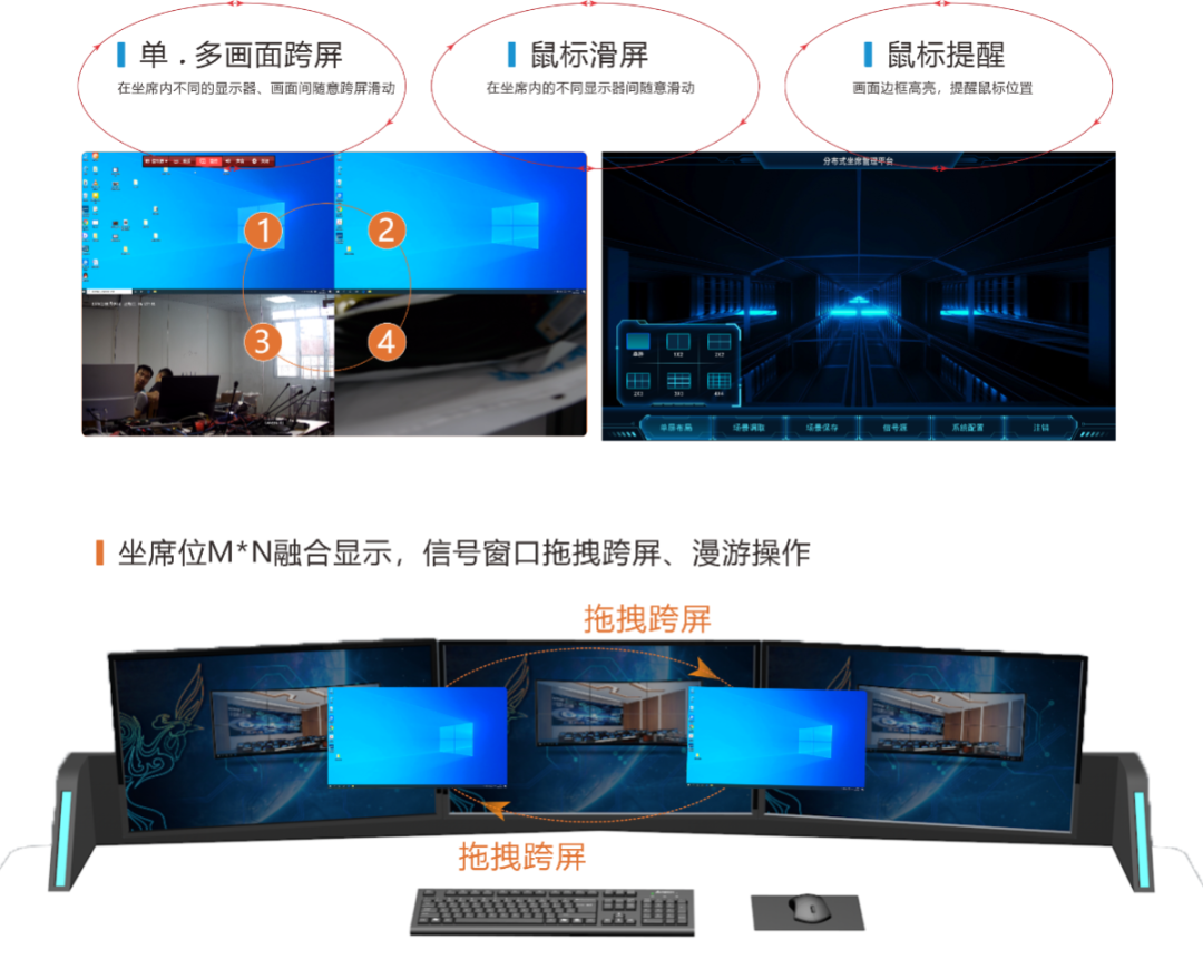 節(jié)點內(nèi)置遠(yuǎn)程KVM鍵盤、鼠標(biāo)功能,視覺零延時KVM,靈活操控遠(yuǎn)程設(shè)備內(nèi)容漫游控制管理。能實現(xiàn)坐席人員使用本地一套鍵鼠方式,對需要投放到本地、異地顯示終端的數(shù)據(jù)信息一鍵推送;坐席人員也可使用本地鍵鼠方式,對數(shù)據(jù)信息獲取至本地座席顯示器顯示;異地同屏、跨地信號互通、移動指揮;坐席員之間可采用圖像、語言、文字等多種方式進(jìn)行全方位協(xié)作;在不同職責(zé)席位員之間進(jìn)行屏幕推送、接管,畫面共享、文件拷貝;可視化OSD菜單操作實時預(yù)覽信號源,所見所得;協(xié)作請求好友提醒,可選擇接受/拒絕;信號窗口支持拖拽跨屏顯示、操作等。便于指揮者進(jìn)行全面正確的分析研斷,滿足用戶異地聯(lián)動、協(xié)同管理的實際應(yīng)用需求。