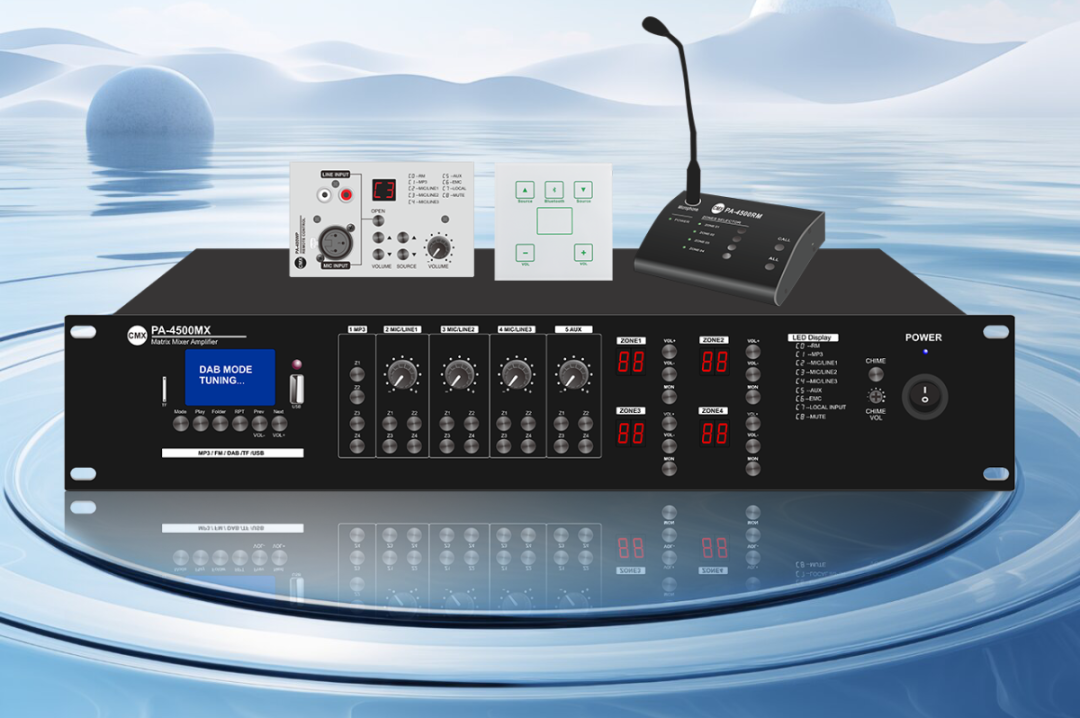 為解決該問題現(xiàn)象的出現(xiàn)CMX最新推出PA-4500MX集成式多媒體功放一體機,系統(tǒng)集成了USB TF 藍牙 MP3播放器、FM收音機、消防報警器、信號分區(qū)器、功率放大器、遠程尋呼站、遠程控制面板等諸多模塊于一體,從根源上解決了項目調(diào)試繁瑣、信號傳輸不穩(wěn)定、維護麻煩的問題。